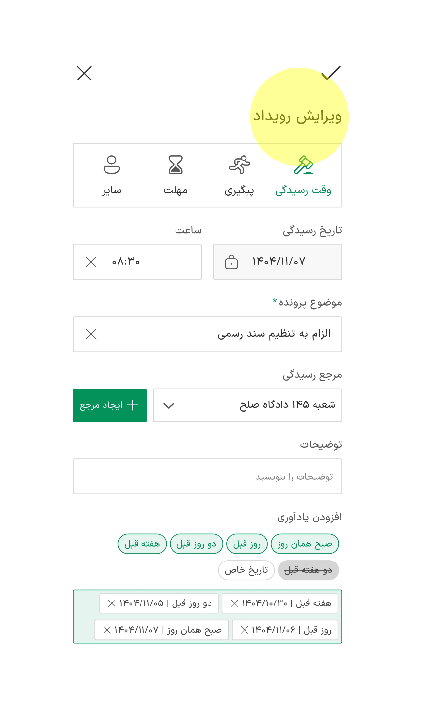 درج رویدادهای مربوط به جلسات رسیدگی، مواعد قانونی و سایر پیگیریها.