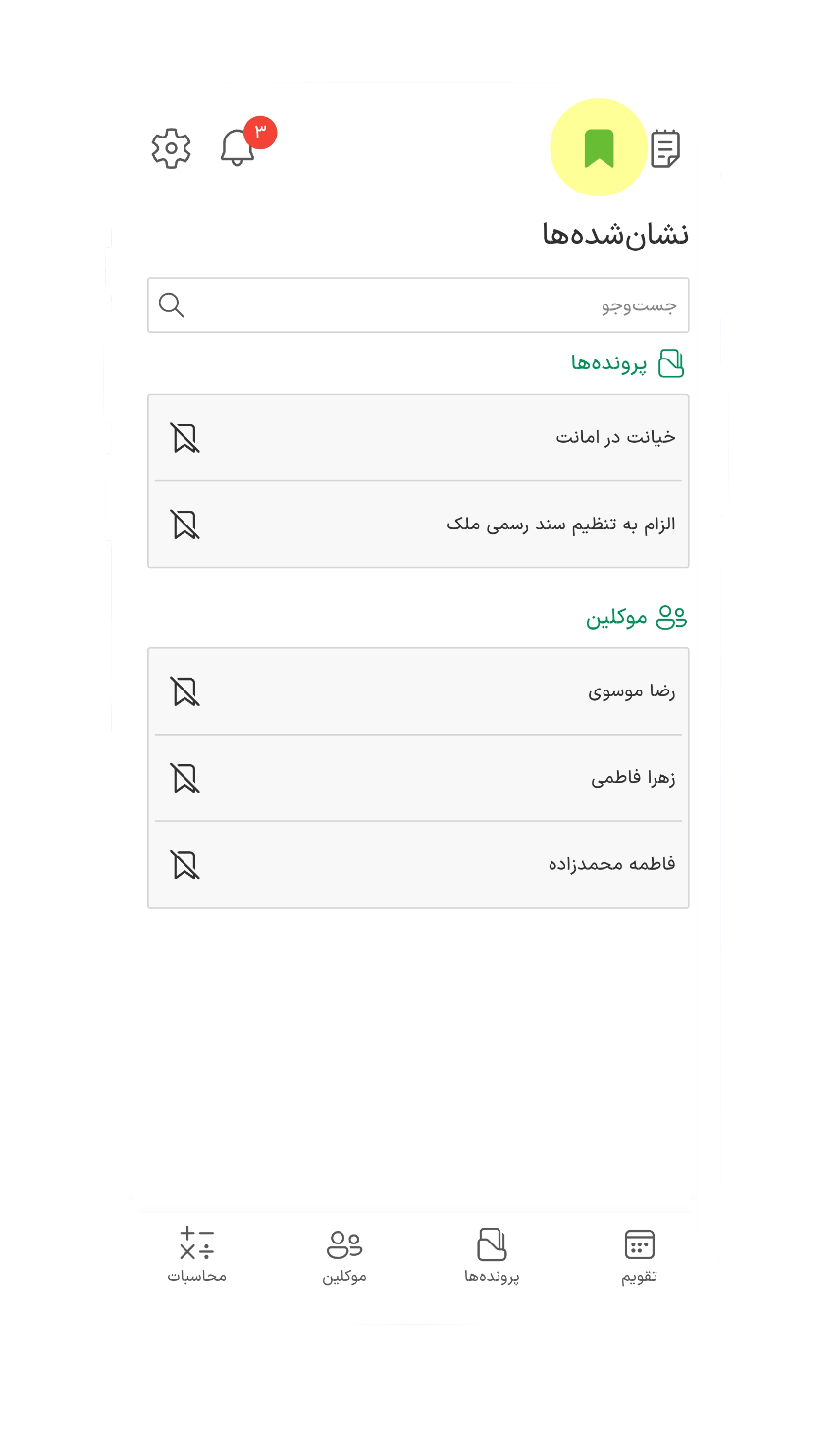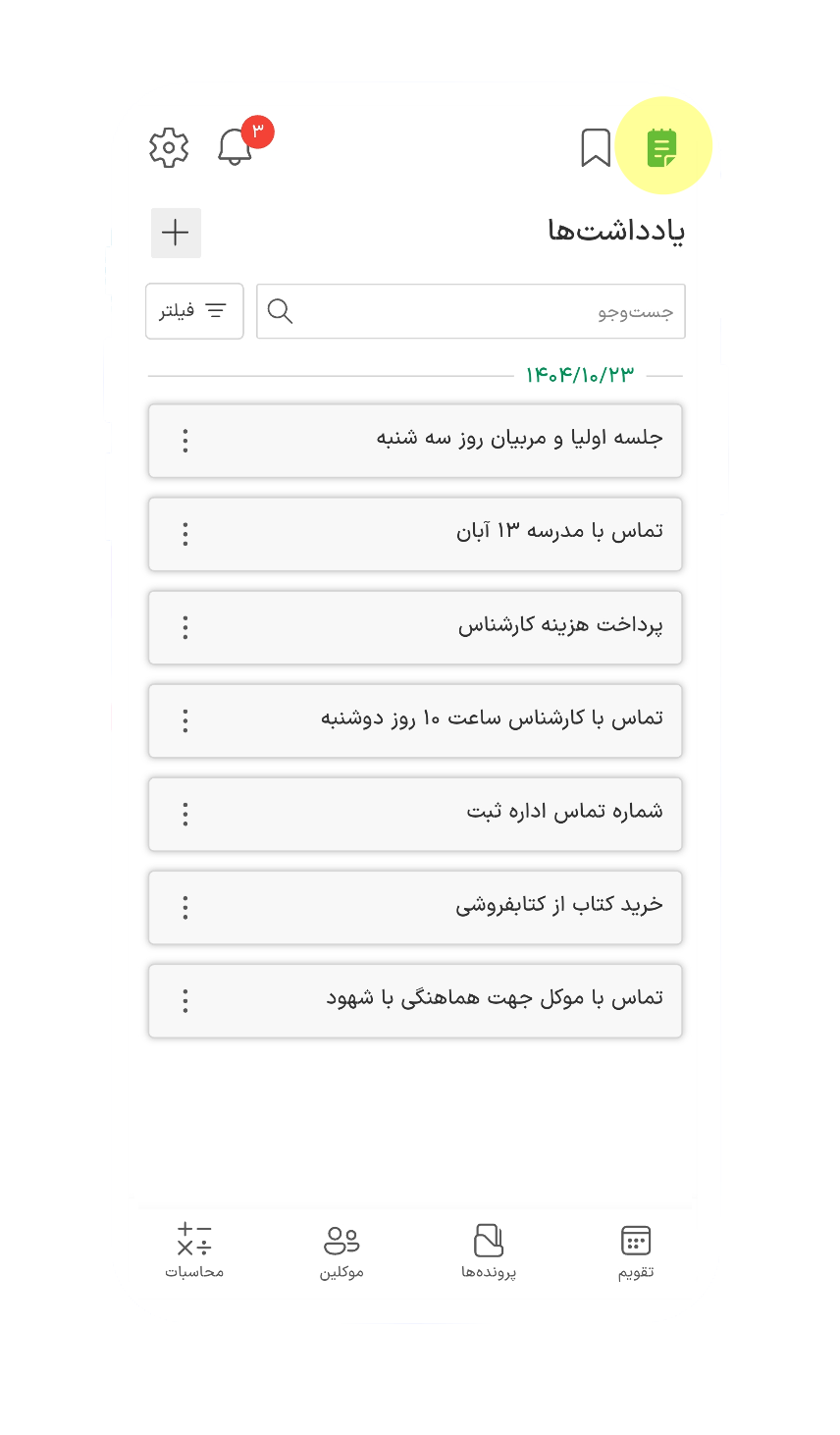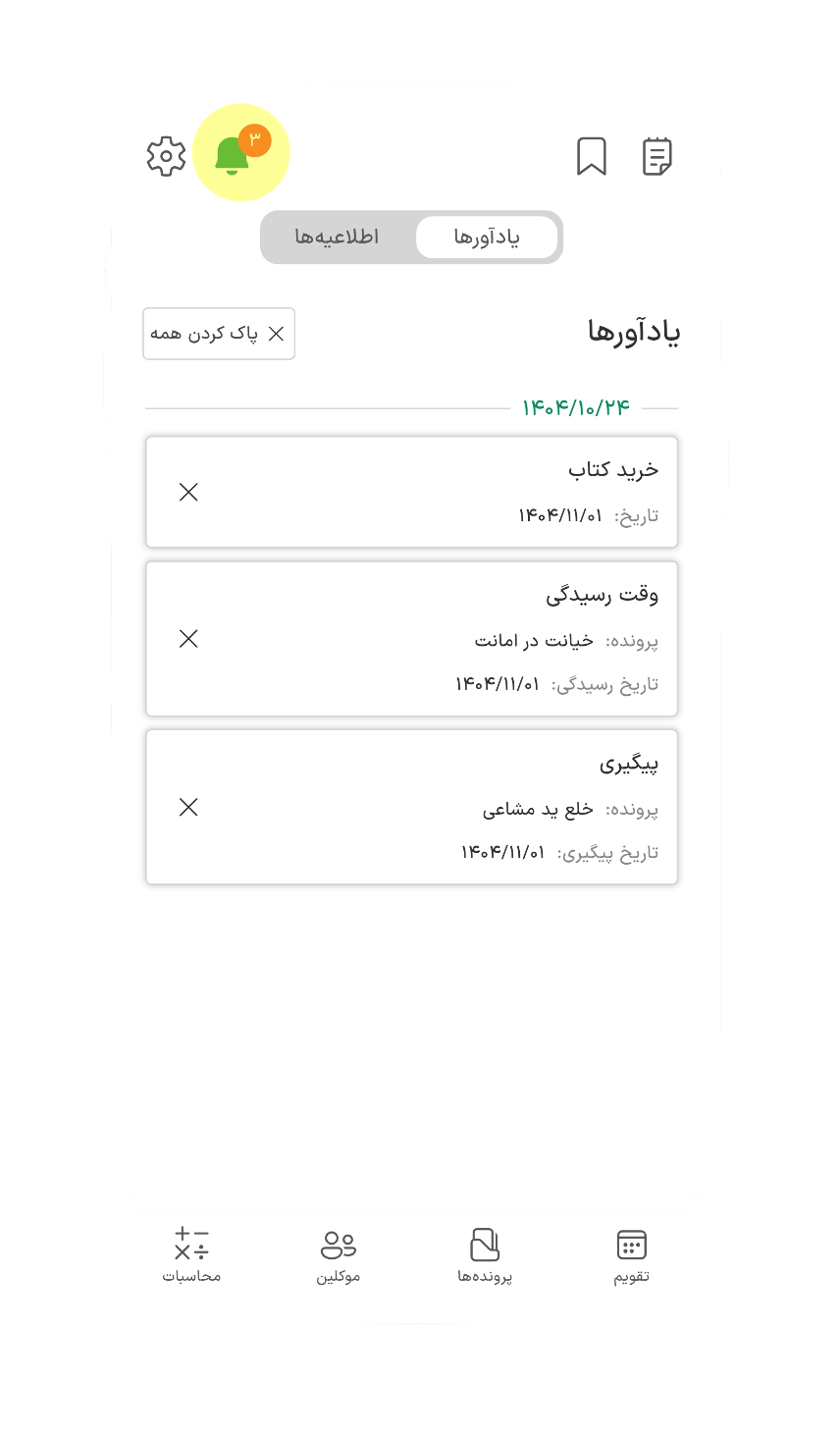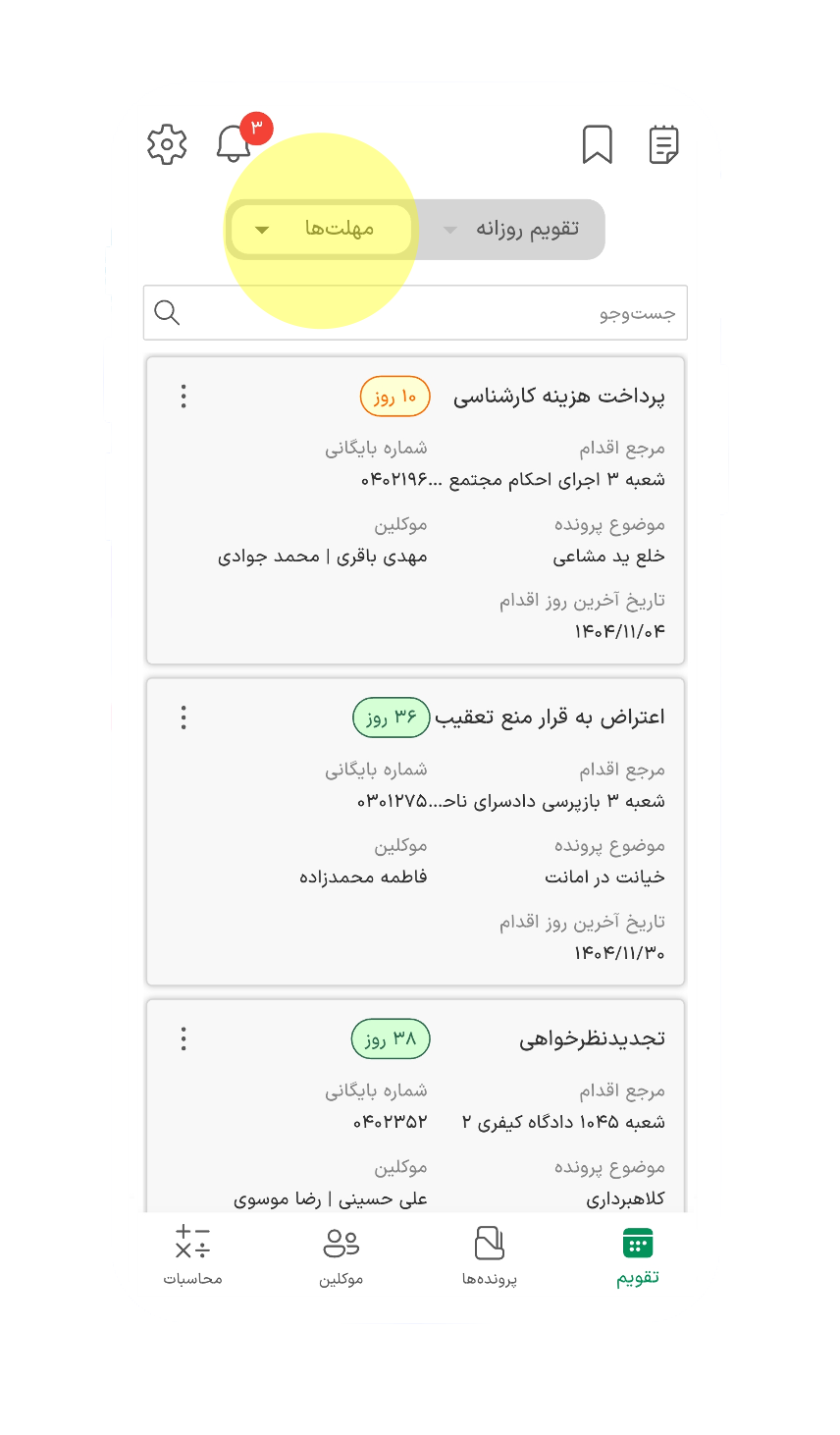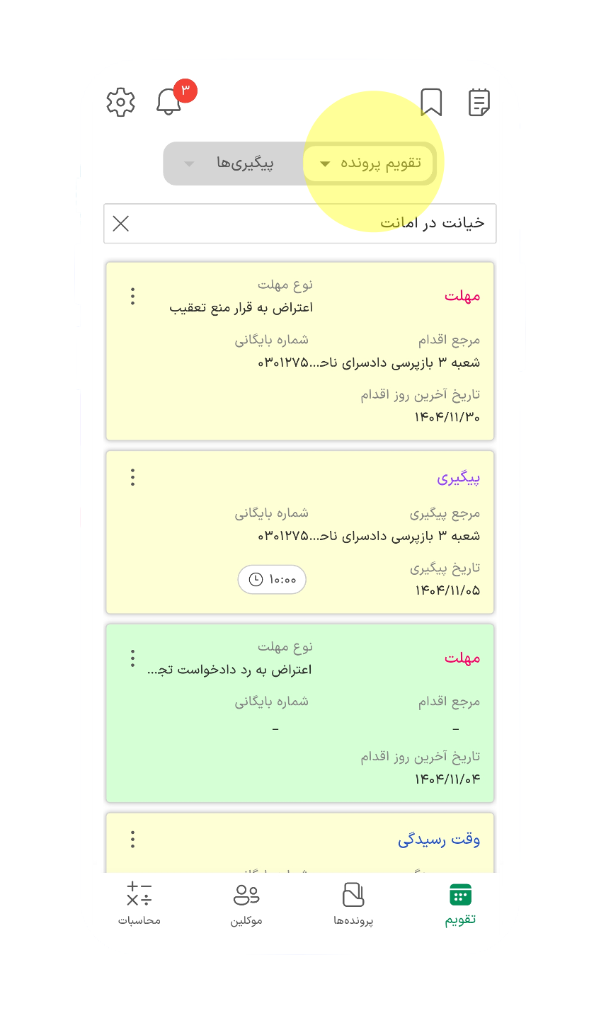 یادآوری مواعد قانونی و جلسات رسیدگی با امکان درج یادآور و کدگذاری رنگی.